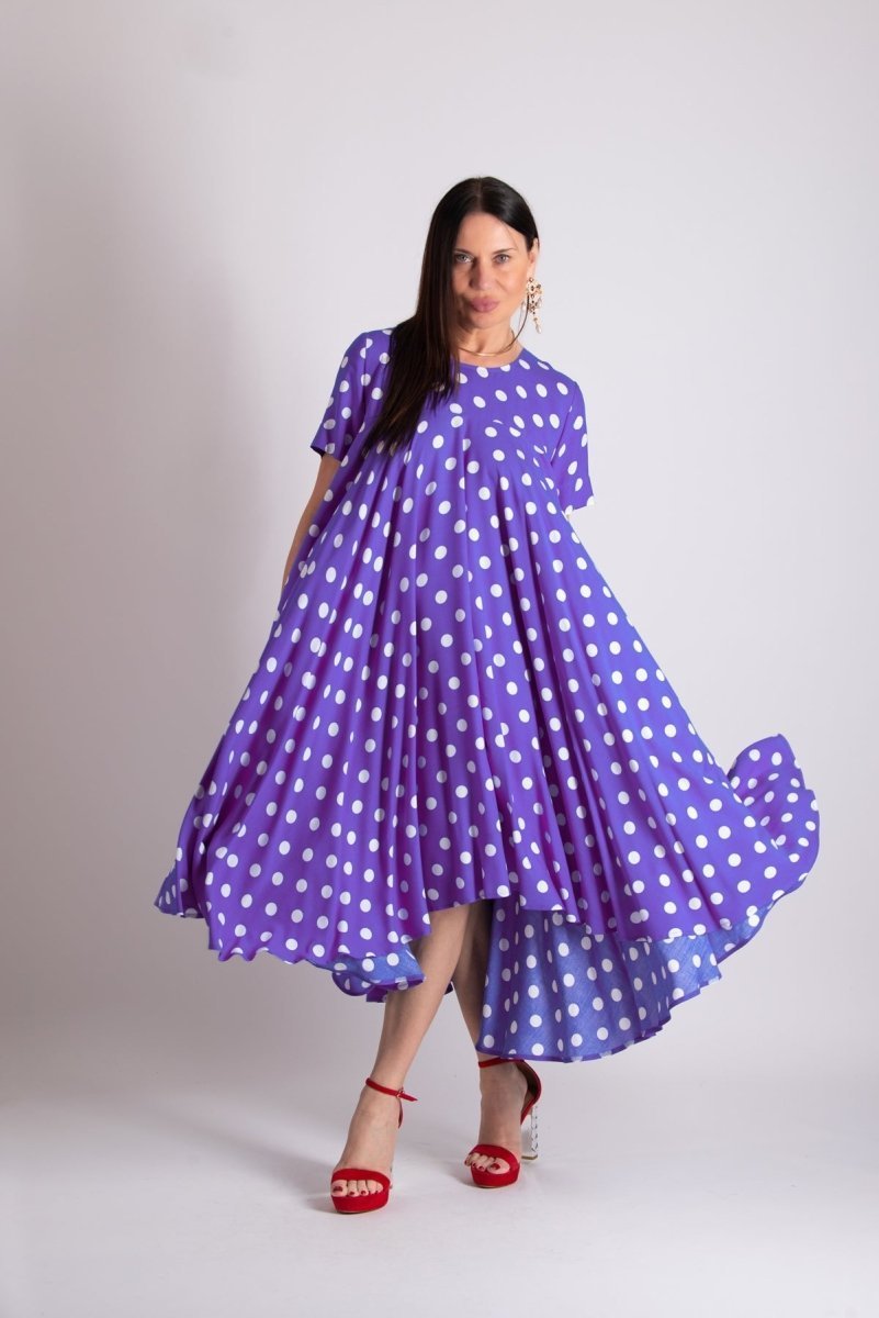 Elevate your summer style with our Purple Polka Dot Summer Maxi Dress KOSARA, a delightful blend of comfort and elegance. Featuring short sleeves and an A-line silhouette, this dress is designed to flatter your figure while keeping you cool and chic on sunny days.