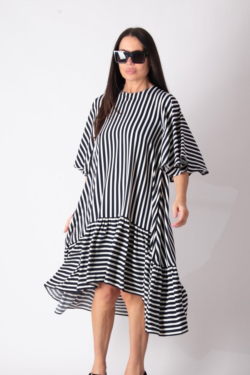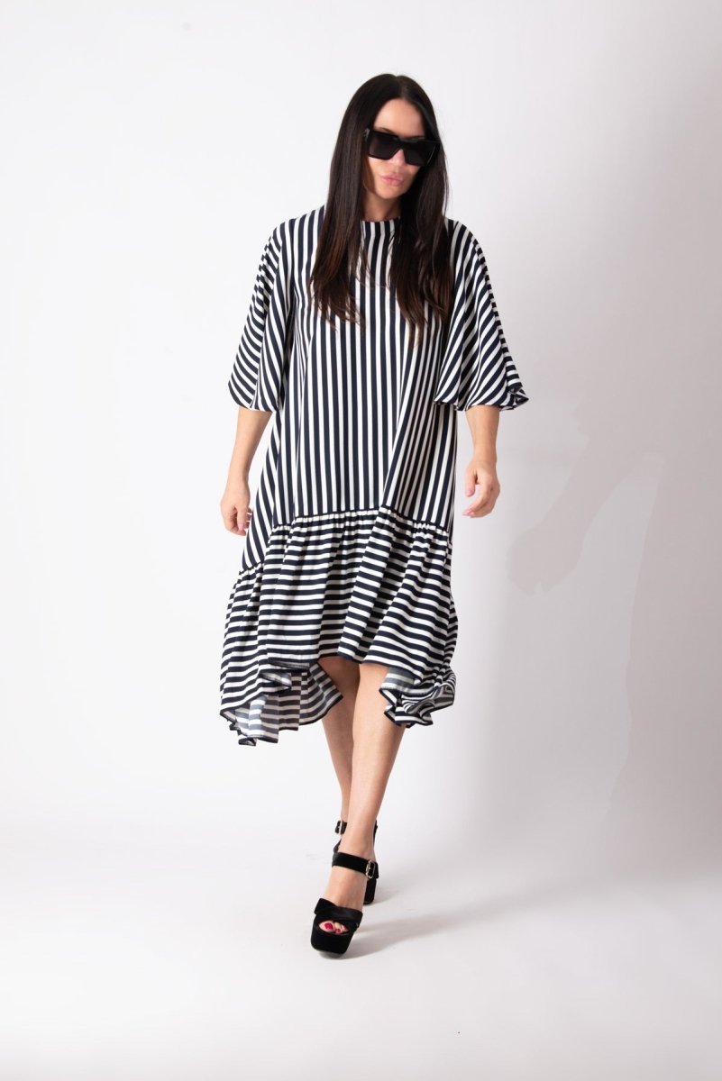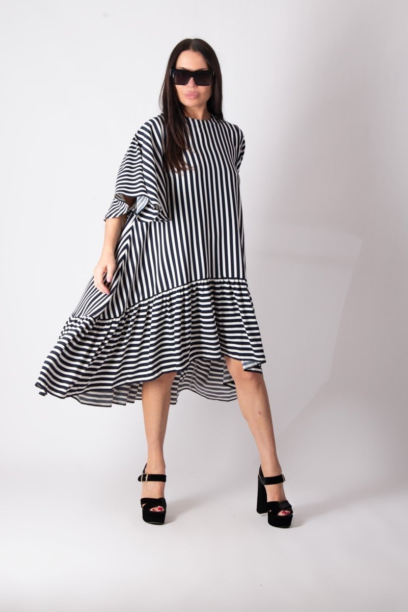 Add a touch of effortless charm to your summer wardrobe with this stunning dark blue and white striped dress. Designed for both comfort and style, this loose-fitting dress features an asymmetrical hemline that falls gracefully below the knee. The ruffle detail at the bottom adds playful elegance, making it perfect for any summer occasion.