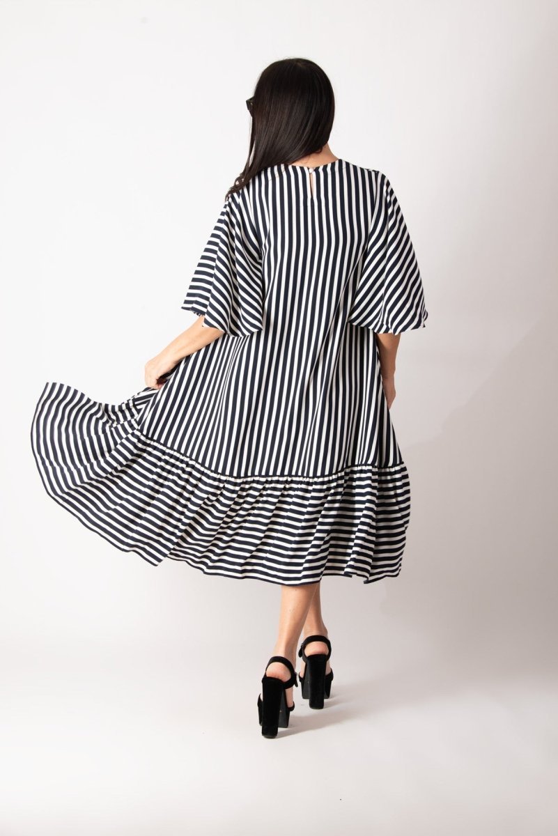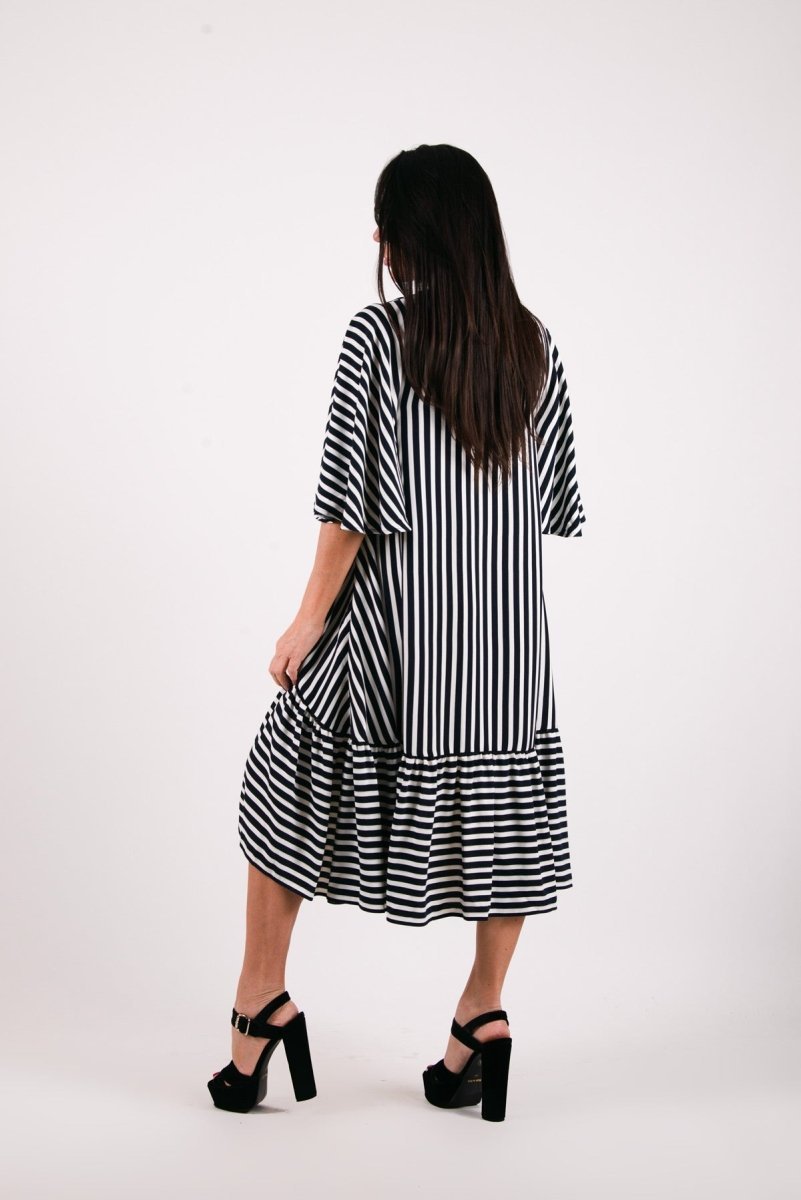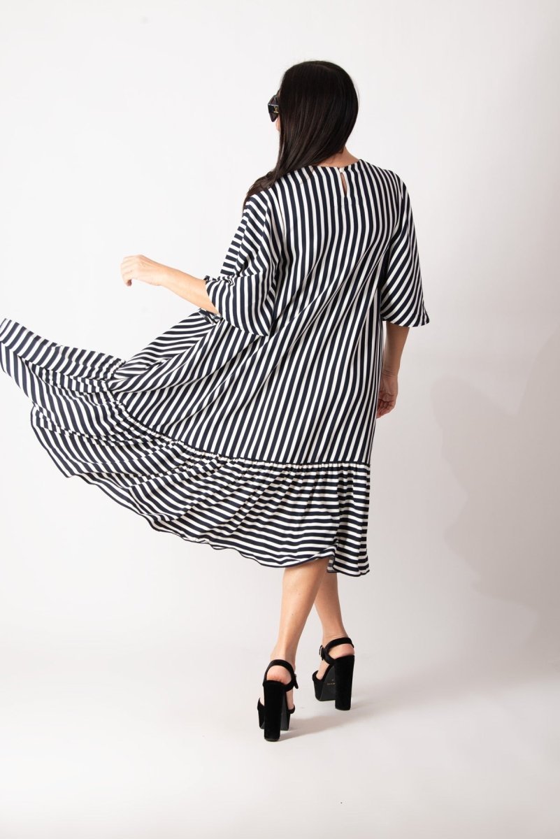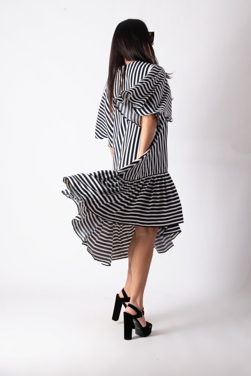 Add a touch of effortless charm to your summer wardrobe with this stunning dark blue and white striped dress. Designed for both comfort and style, this loose-fitting dress features an asymmetrical hemline that falls gracefully below the knee. The ruffle detail at the bottom adds playful elegance, making it perfect for any summer occasion.